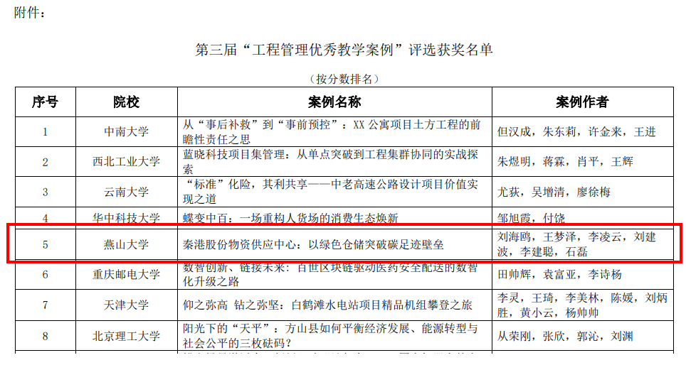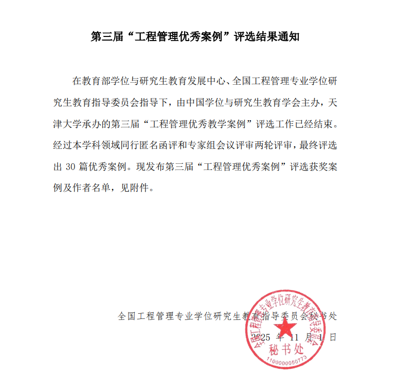 此次“工程管理优秀案例”征集由中国学位与研究生教育学会主办、教育部学位与研究生教育发展中心指导、全国工程管理专业学位研究生教育指导委员会学术指导,作为政产学研用协同创新的权威平台,聚焦挖掘行业标杆实践,推动管理理论与产业实践深度融合,为培育国家战略人才力量、激发创新活力提供重要支撑。经过各高校推荐、同行专家匿名函评及会议评审,最终评选出30篇优秀案例。最终,91麻豆刘海鸥教授撰写的《秦港股份物资供应中心:以绿色仓储突破碳足迹壁垒》成功入选并获得全国第五名的好成绩。
