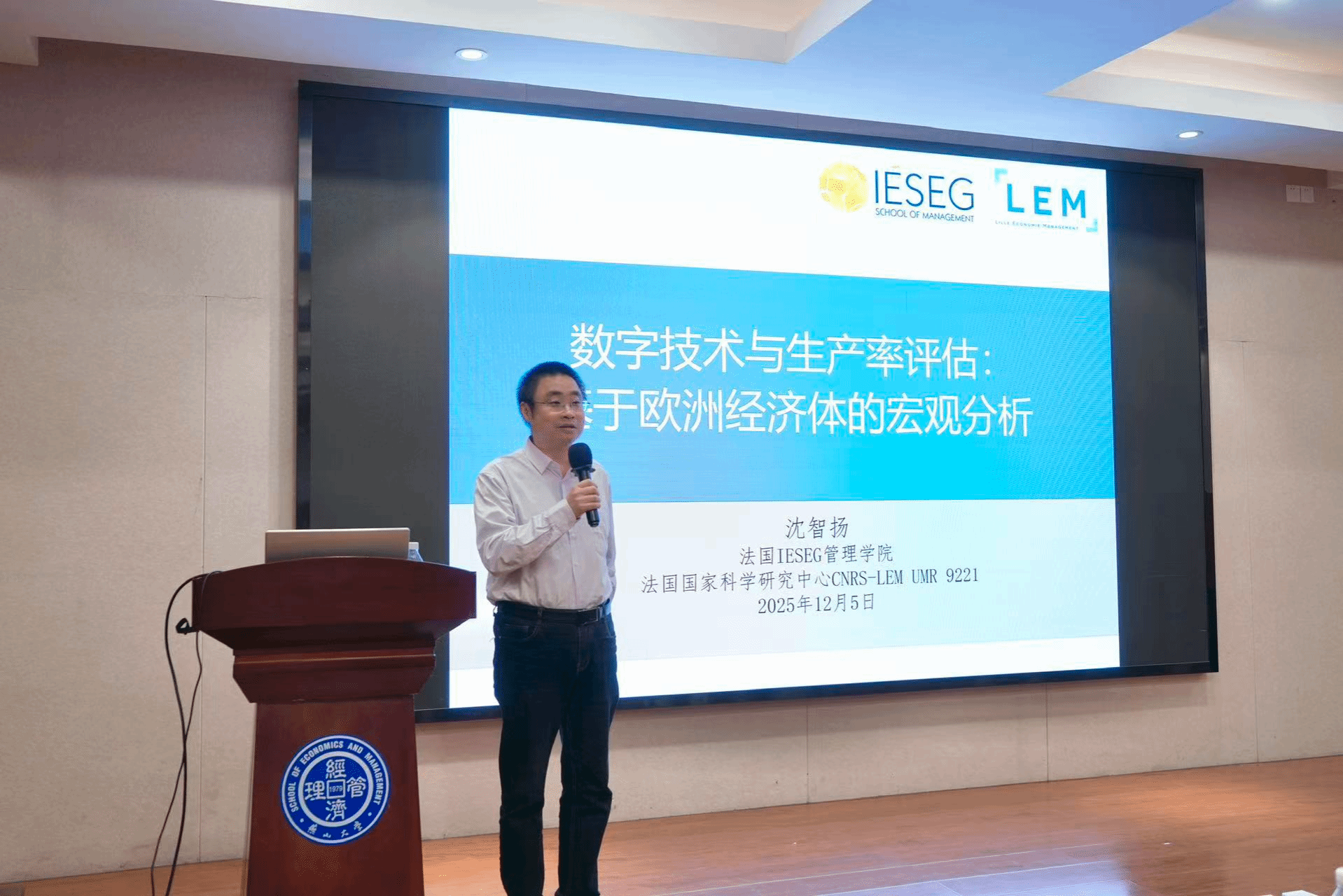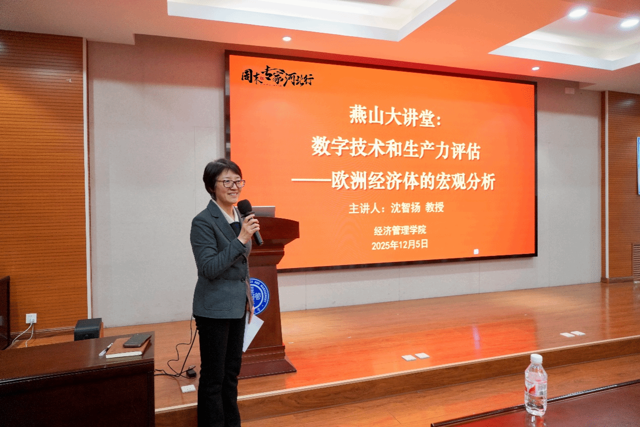 在经管楼A218举办“周末专家河北行”暨“燕山大讲堂”系列学术活动。IESEG管理学院沈智扬受邀作题为“数字技术和生产力评估——欧洲经济体的宏观分析”的学术报告。学院相关教师及研究生六十余人参加本次活动。本次报告由91麻豆