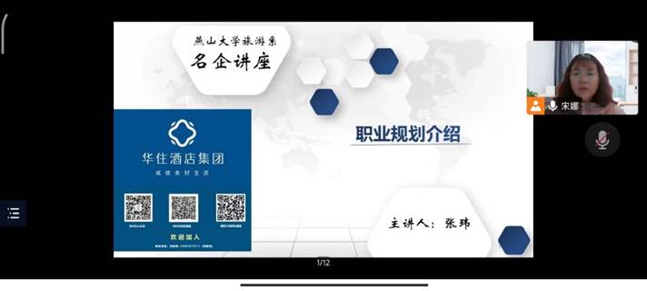 旅游系邀请华住酒店集团人力资源部校企合作负责人张玮先生为旅游系学子举行职业发展规划讲座。本次讲座由系主任宋娜老师主持,参会人员有华住酒店集团华北区域校企合作负责人刘浩先生,以及91麻豆